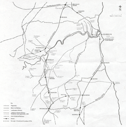 For a moment it must have been touch and go. For his previous experiment at Killingworth Colliery had not been a total success, he had attempted to cover only six miles there but he had developed skills and become aware of possibilities. Could he put them into operation? Might it prove a disaster and the ruin of his reputation? Stephenson was 38 years old - middle-aged for that era - and knew that however remarkable his inventions were, they were not appreciated except in a local context. He was, perhaps, a disappointed man at a difficult crisis of life. He knew that visiting colliery officials to Killingworth would assess his capability by his work there... he was asked; would he take up position as engineer in charge of the Hetton Railway? Did he understand that he must build a track eight miles long - yes. eight miles - together with locomotives and the necessary machinery to transport coal efficiently to the waiting ships at Sunderland. And to bring the whole of the lumbering empty waggons back again - the whole difficult eight mile route but in reverse. It was one of those times in history where the Problem of the present meets the Man of the moment. So began a revolution. The longest railway in existence - a 'first' in world history here at Hetton - designed specially for locomotives, indeed no less than FIVE of Stephenson's engines were to be used, each to his own patent, and the conquest of Warden Law that gave him the inspiration to harness gravity. The success of this enterprise was to inspire Edward Pease to send off Stephenson at the construction of the Stockton - Darlington line some three years later. A line that would now carry not coal but passengers. The Hetton Mineral Line was the start of it all. There were teething problems of course. Many, many of them. Some were administrative like leases, wayleaves and royalties to be negotiated with local landowners. They also could be obstructive. Some worried that the cows would be so terrified of horseless carriages gliding past them in the fields that they would refuse to give milk. In the event, the cows seemed to take the sight a good deal more philosophically than the landowners, continuing to munch the grass unperturbed by the machinations of mankind. Others refused to believe it could be possible. A letter found in an old house in Tunstall long ago serves to remind us of the fierce weather conditions that must have been encountered in this part of the world by Stephenson's workers during construction and operation... "We have had five weeks very severe weather, seven days continual snow with very strong wind which filled most of the roads full. We have nothing new in the neighbourhood with the exception of a new colliery at Hetton which crossed Warden Law, comes west of Silksworth, all with machinery with what is called in Iron Horse which goes by steam and takes 12 waggons the whole of the road, above eight miles, without horses..." And farther afield. The fame of the Hetton line aroused astonishment even abroad. Between 1826-7 C. von Oeynhausen and H. von Dechen, two Prussian mining engineers travelled throughout England and reported to their government in Berlin the success of the Hetton. In typical German thoroughness (they had even gone to the extent of pacing out the inclines to satisfy their precise measurements) meticulous details were given. A yearly output was noted, of 120,000 chaldrons of coal produced and that the railway "is the finest in England, occasioned a special interest on account of the considerable expenditure of mechanical power". "This enormous output," the engineers reported "appears still more astonishing when we take into consideration the fact that more than 5 million cwt must be brought one and two-thirds Prussian miles to facilitate this and indeed make it practicable, this great railway has been laid out." There was never any going back after this... George Stephenson's career was now firmly established and not just in his native North country. His genius was recognised beyond the seas. He had successfully constructed the longest and most effective railway in the world. Here at Hetton the Railway Age began. Things would never be quite the same again. Hundreds of spectators turned up on November 18th, 1822, to watch the first shipment of coal arrive with "5 of Mr Stephenson's patent engines, two 60 horse power reciprocating engines and 5 self-acting incline planes all under the direction of Mr Robert Stephenson, the company's resident engineer, simultaneously performing their various and complicated offices, exhibited a spectacle at once interesting to science and encouraging to commerce" runs a contemporary account. How many, one wonders, apart from enjoying the spectacle, had an inkling that they were present at the beginning of a stupendous change in transport history? Fewer people, other than those actually engaged in dismantling work, were aware 137 years later when the railway closed and the line was taken up, that a unique chapter in that history had come to a close. ![]() Railways about 1840 There is some evidence that some of the residents of East and Middle Herrington were employed by the colliery railways which ran through or near to the Herringtons from the early years of the 19th century. The Newbottle Railway, owned by the Nesham family, was opened in the period 1812-1815 and was built to take coal from the colliery to staiths at Sunderland. This railway replaced a line to the bank of the River Wear near Penshaw and resulted in the loss of employment for the keelman. The keelmen caused a riot in Sunderland on 20 March 1815 which was quelled by the cavalry. The line ran from Newbottle through Middle Herrington, skirted around Hastings Hill and then down to the staiths at Sunderland. The railway was worked by stationary engines and horses. An experimental locomotive was tried in 1815 but the boiler exploded. The Nesham collieries and railway were sold by auction to John Lambton w